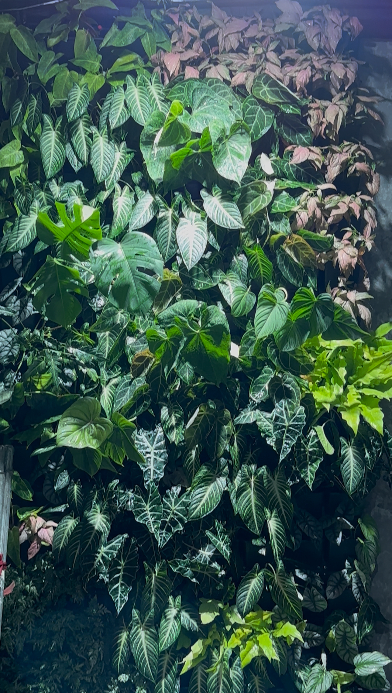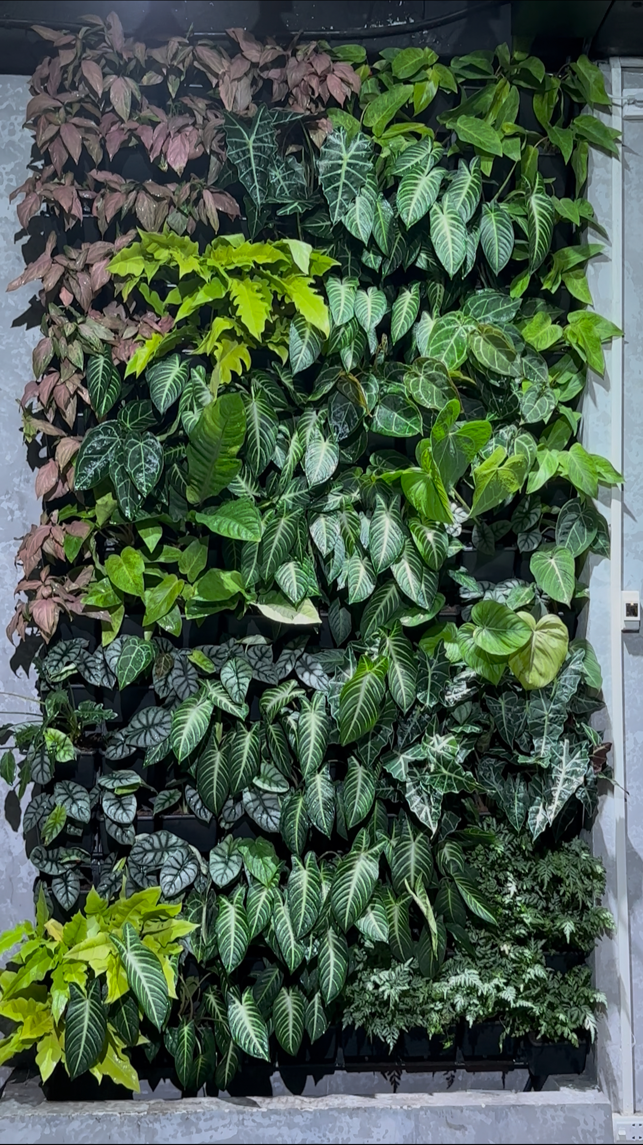 Hai bức tường cây được lắp hệ thống tự tưới và đèn chiếu sáng tự động, đảm bảo cây luôn xanh mượt và phát triển khỏe mạnh.