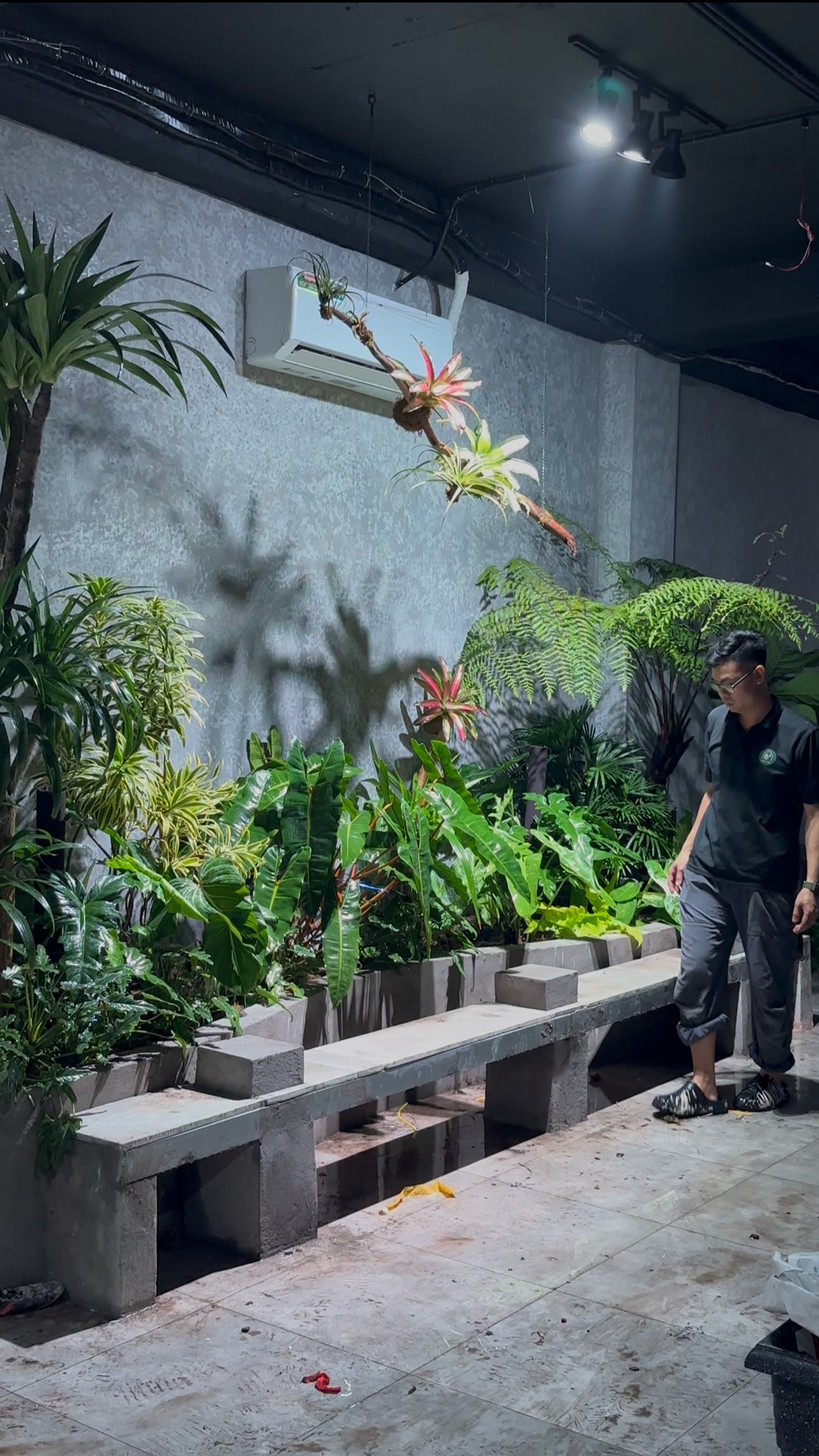 Các cây được bố trí theo đa tầng – đa chất liệu, tạo chiều sâu và cảm giác rừng nhiệt đới thu nhỏ.
