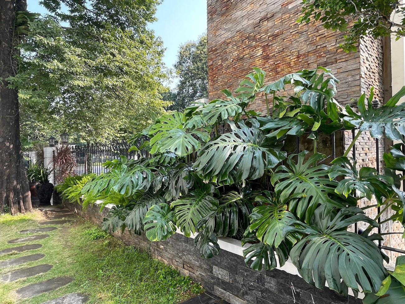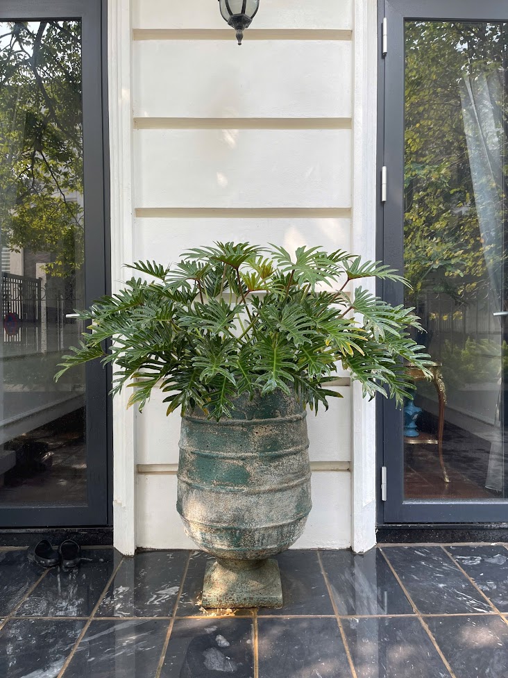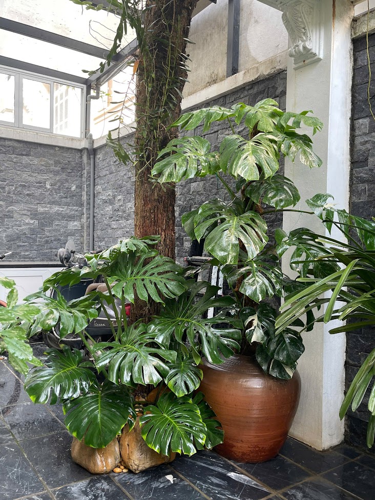 Song song đó là một bồn cây dài trồng Monstera size đại, những phiến lá xẻ lớn đặc trưng giúp tạo chiều sâu không gian. Phía chân bồn được mix thêm các dòng Anthurium lá gân nổi, vừa làm lớp nền xanh, vừa tăng độ chi tiết và sự sang trọng cho khu vực mặt tiền sân vườn.