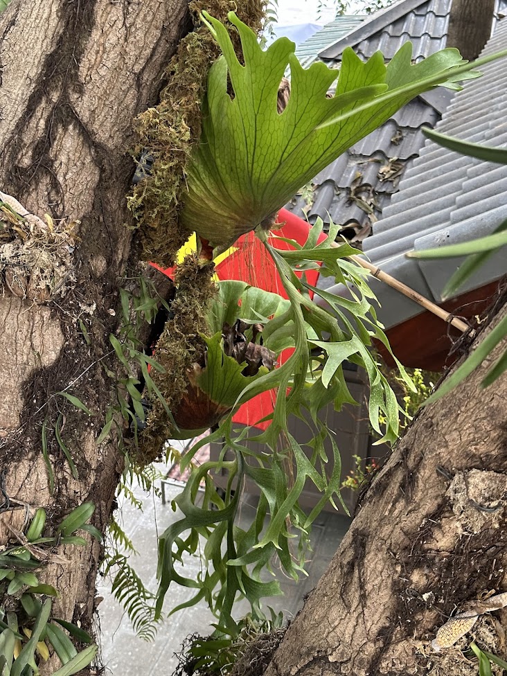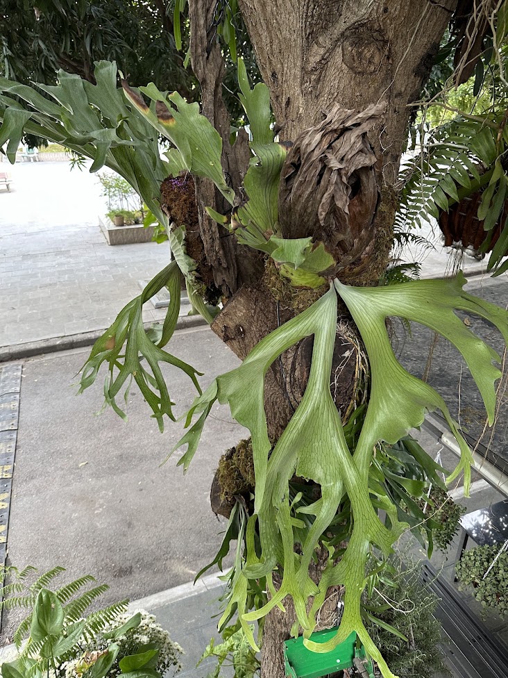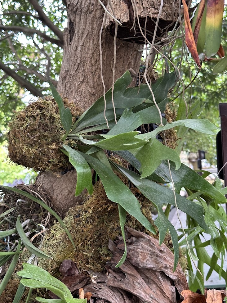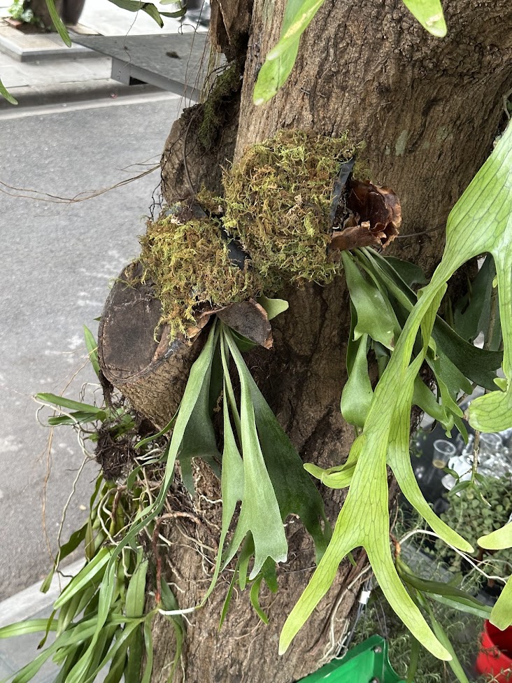 Các mảng ổ rồng được xử lý và cố định trực tiếp lên thân cây xoài cổ thụ, tạo cảm giác cây và cảnh quan hòa làm một. Ổ rồng giúp giữ ẩm, tạo nền sinh học lý tưởng cho các loài cây bám thân phát triển ổn định trong thời gian dài.